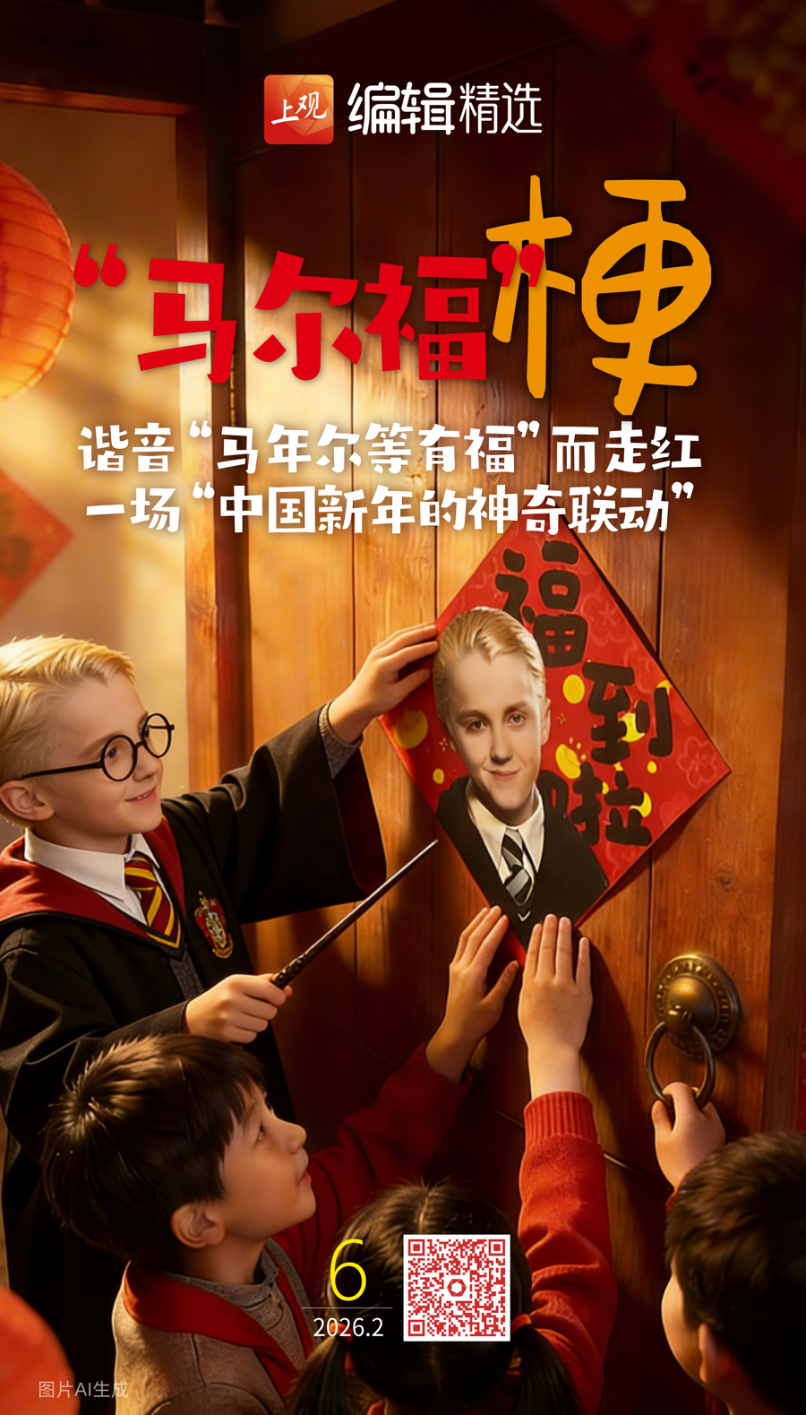 最近,《哈利・波特》里的马尔福蓦然在中国爆火,成了马年稳定物。阿谁金发少年的头像与福字聚拢,被制作成新年控制,阛阓里挂起马尔福春节海报,“马尔福福字”在电商平台热销……CNN、BBC等国外媒体也于2月4日温雅到了这股飞腾。最说念理的是,马尔福的演出者——38岁的英国演员汤姆・费尔顿也在外交媒体上回答了此事,“这是我的马年有福了”,并配“全部顺风”图,平直参与中国网友“马到福来”的玩梗步履中来。这场不期而至的新年狂欢,见证了中国文化以最草率最纯真实姿态融入全球平素。